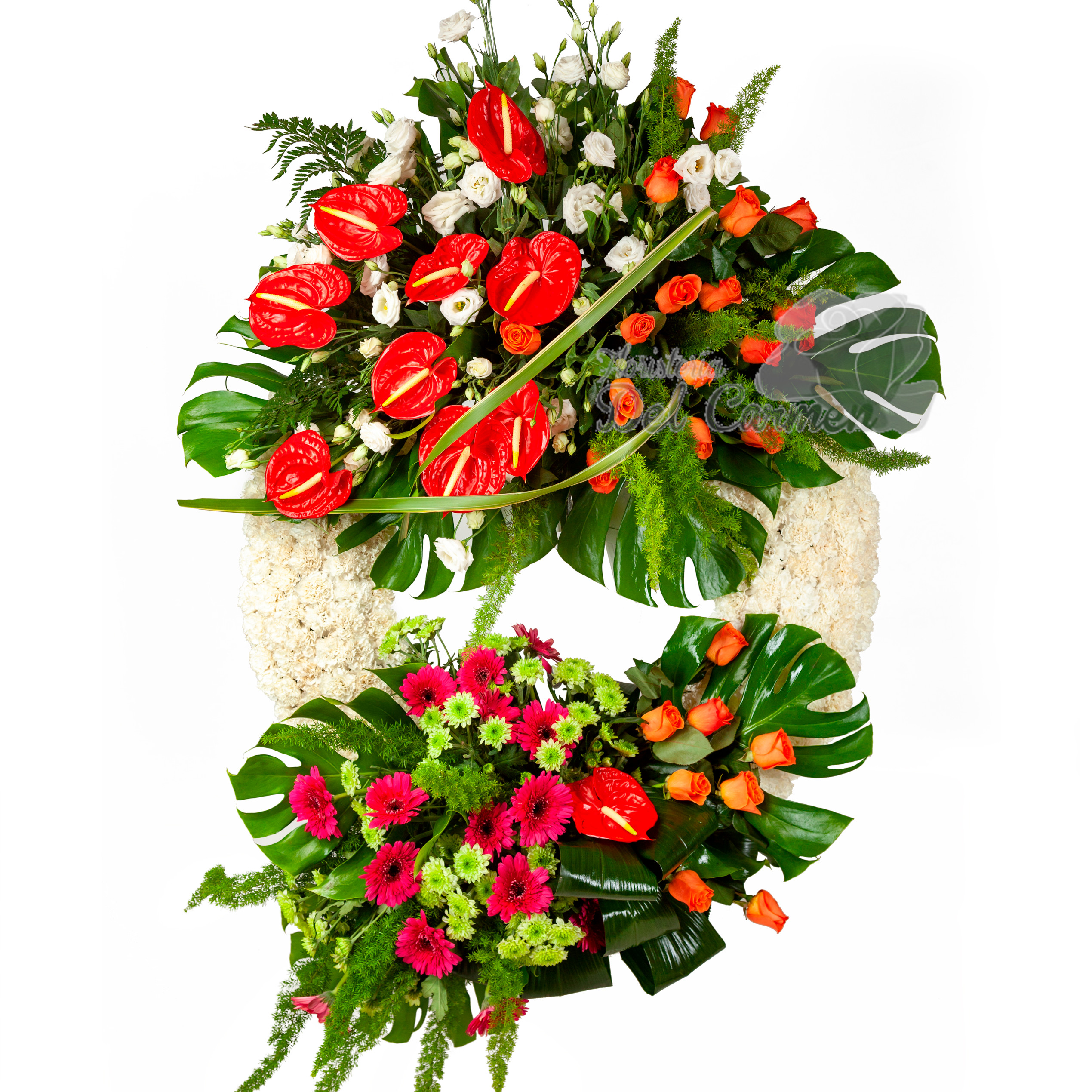 Corona de flores Promesa, compuesta por dos cabezales con anturium rojos, rosas en color naranja, lisiantum blancos y el cabezal inferior con gerberas fucsia, rosas en tono naranja y margaritas en color verde kiwi, todo ello sobre una base de verdes exclusivamente seleccionados.