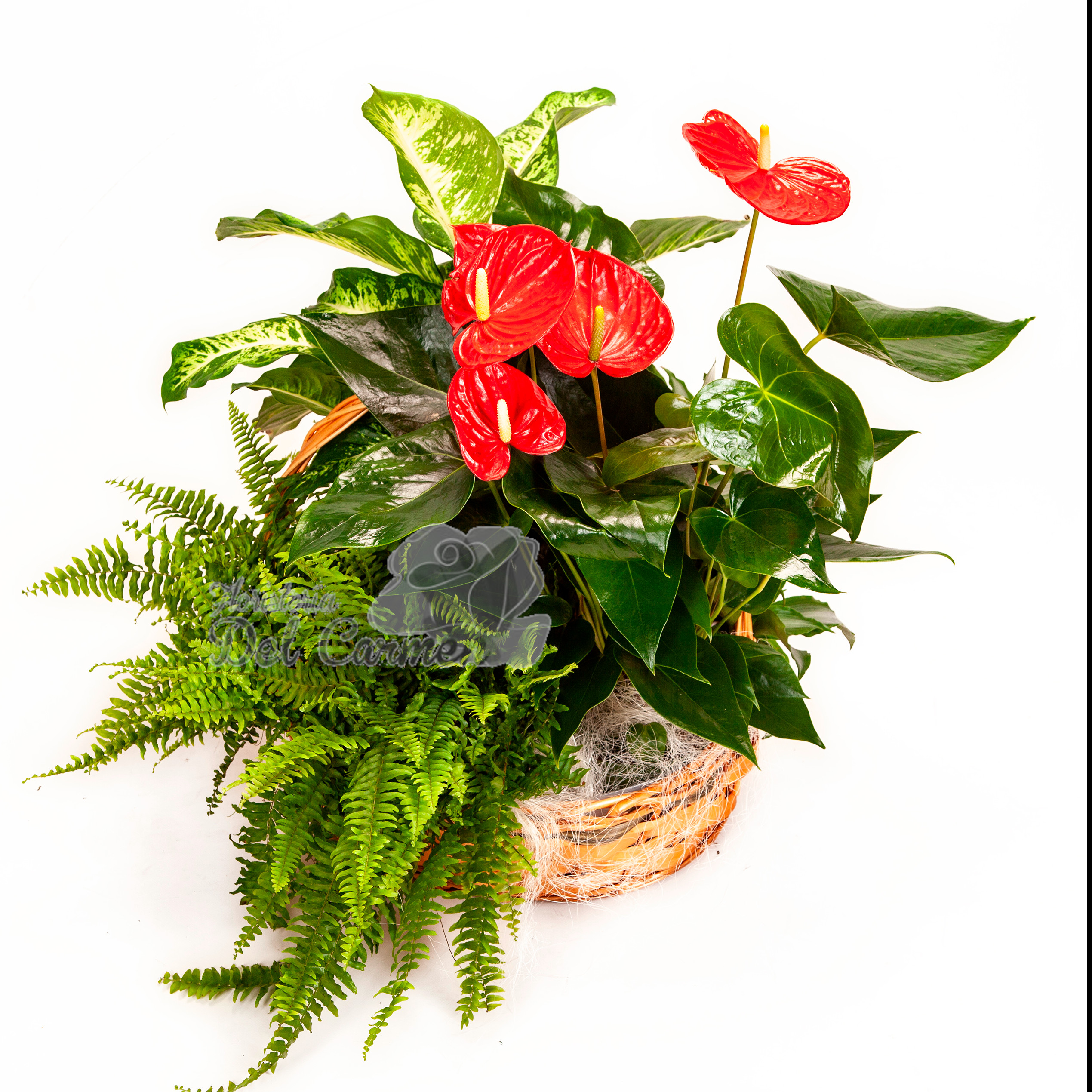 Original composición compuesta de anturium blancos y rojos y una exclusiva selección de verdes con adornos y un cesto de mimbre, ideal para un regalo bonito y original.