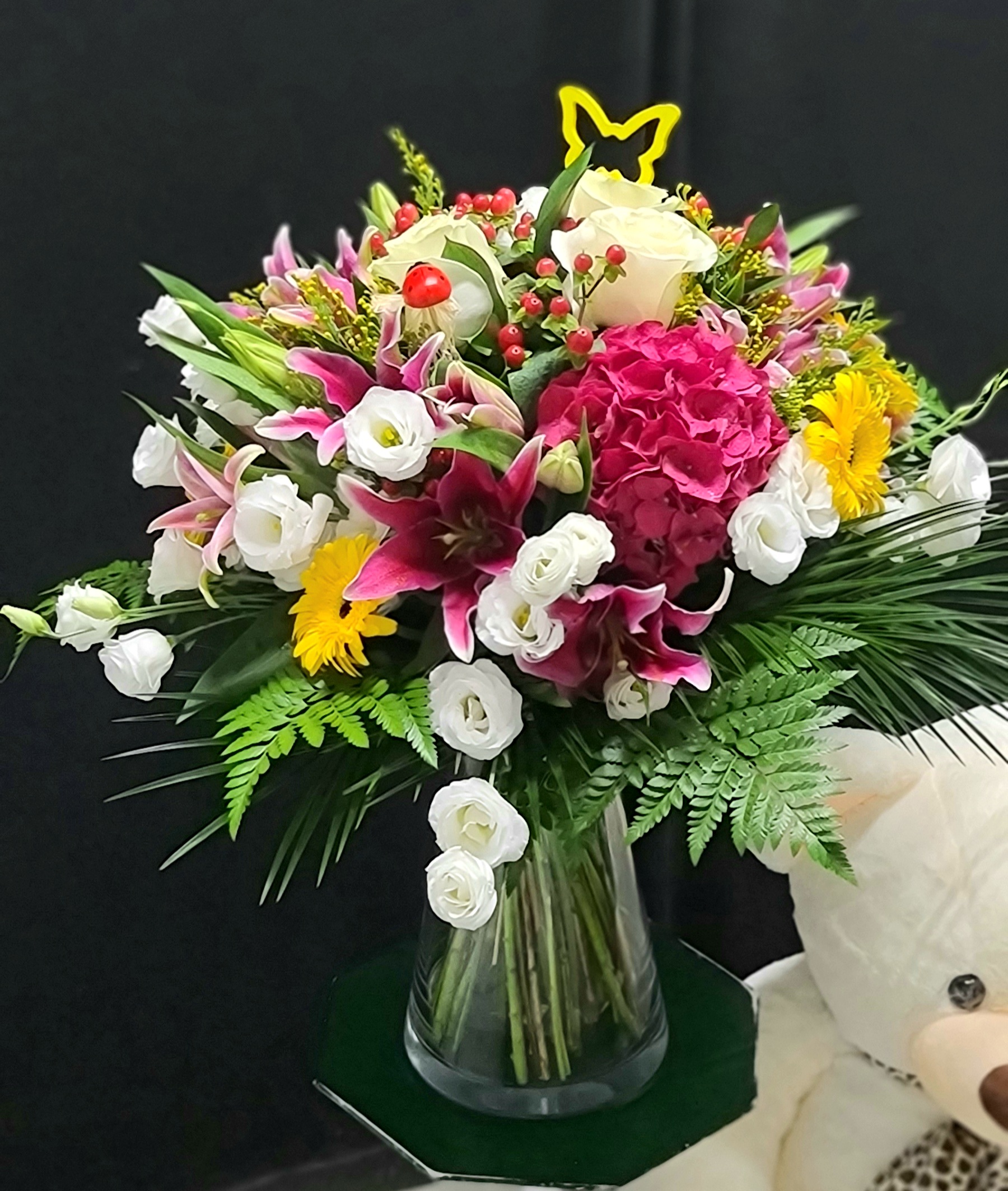 Bella composición floral para un regalo perfecto. Un ramo de tamaño grande compuesto de una selección de lilium, hortensias, rosas, lisiantum.