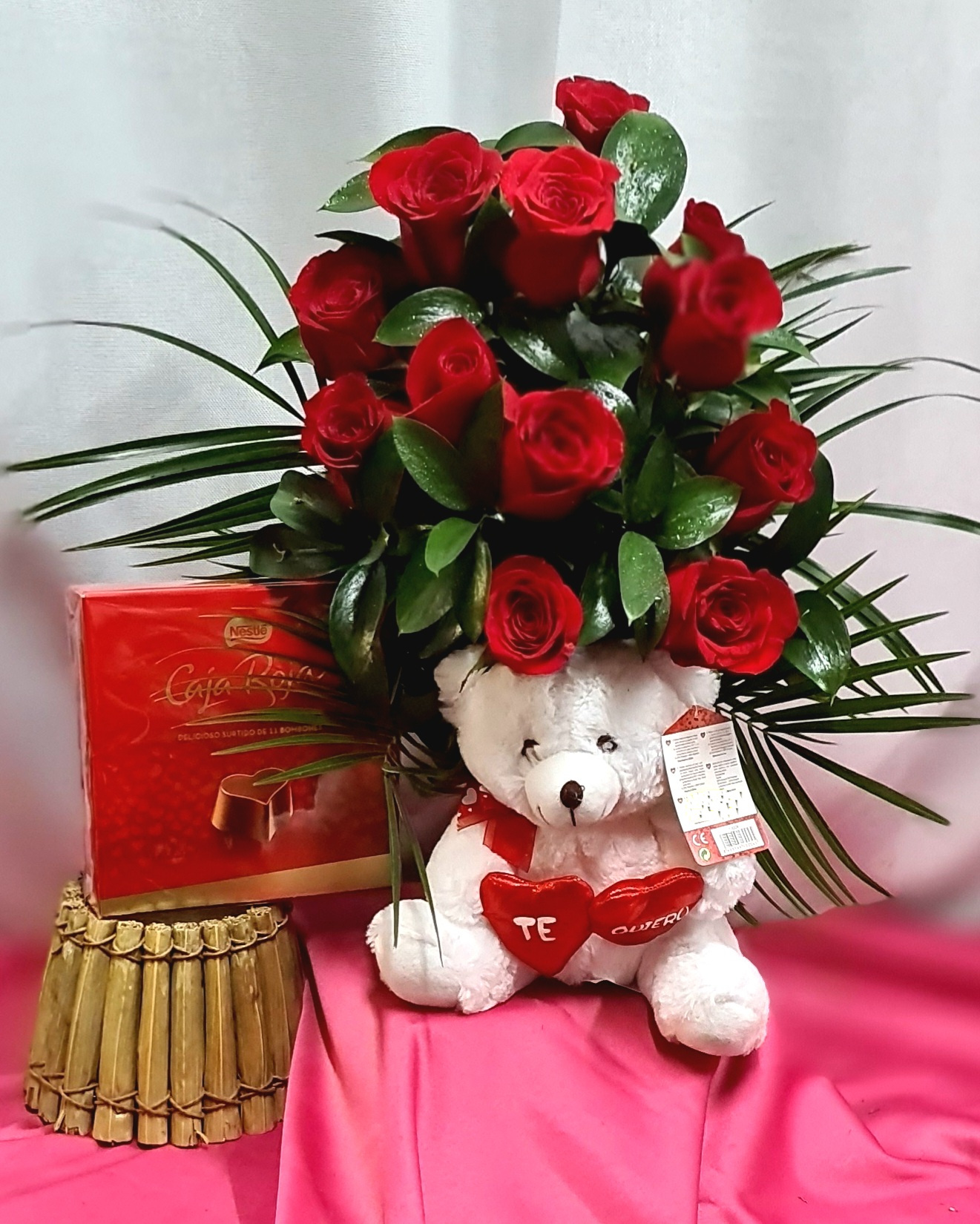 Además, incluida caja de bombones y peluche dan a este precioso regalo un motivo especial para esa persona especial.
